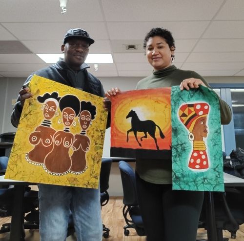 Global Lounge Featured Artist and former artist in residence Amiri Osman is a mentor who was passing on the Batik art cultural Tradition to Meridian Negilski a mentee at the Global Lounge Commons through the Traditional Arts Apprenticeship grant program from Idaho commission on the arts.